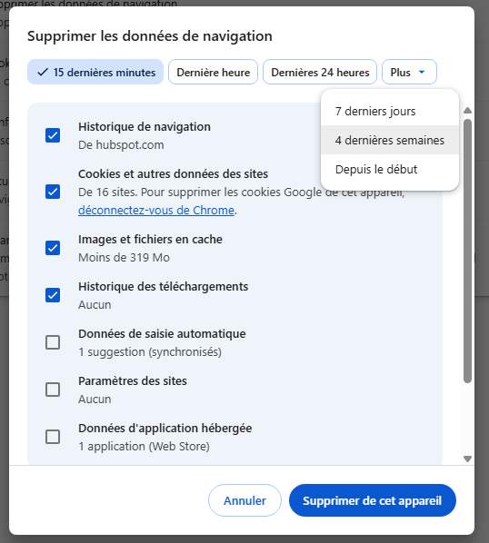 - Cochez les types d'informations, Historique / cookies / images et fichiers en cache.