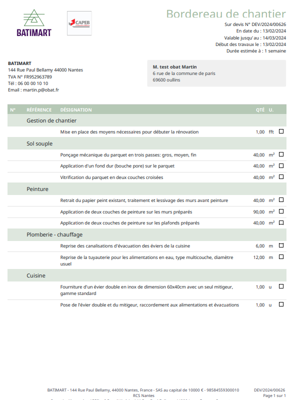 Jean, ouvrier, ouvre son application OBAT. Il clique sur l’intervention du jour, et consulte immédiatement le bordereau de chantier lié. Il sait quoi charger dans son camion, sans appeler personne.