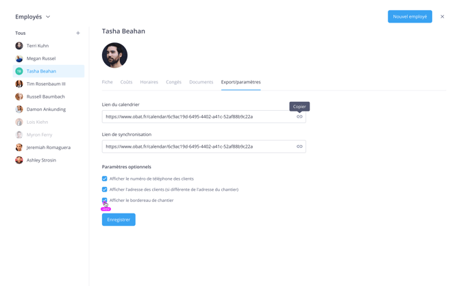 Dans la fiche de chaque ressource (employé, intérimaire, sous-traitant), une nouvelle case « Afficher le bordereau de chantier » est disponible dans l’onglet Export / Paramètres. Elle est désactivée par défaut : vous choisissez qui y a accès.