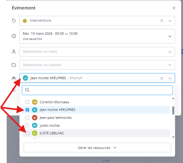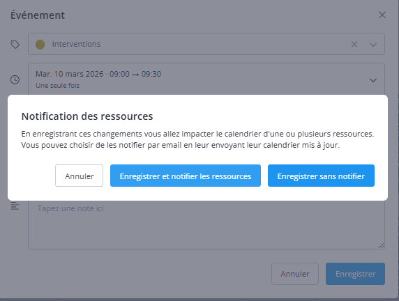 Les ressources associées à l’événement apparaissent également. Vous pouvez les modifier directement depuis l’onglet dédié si besoin.
