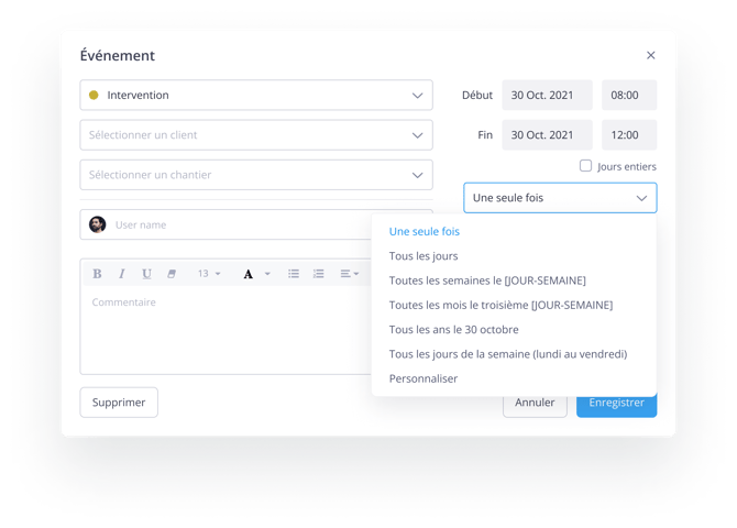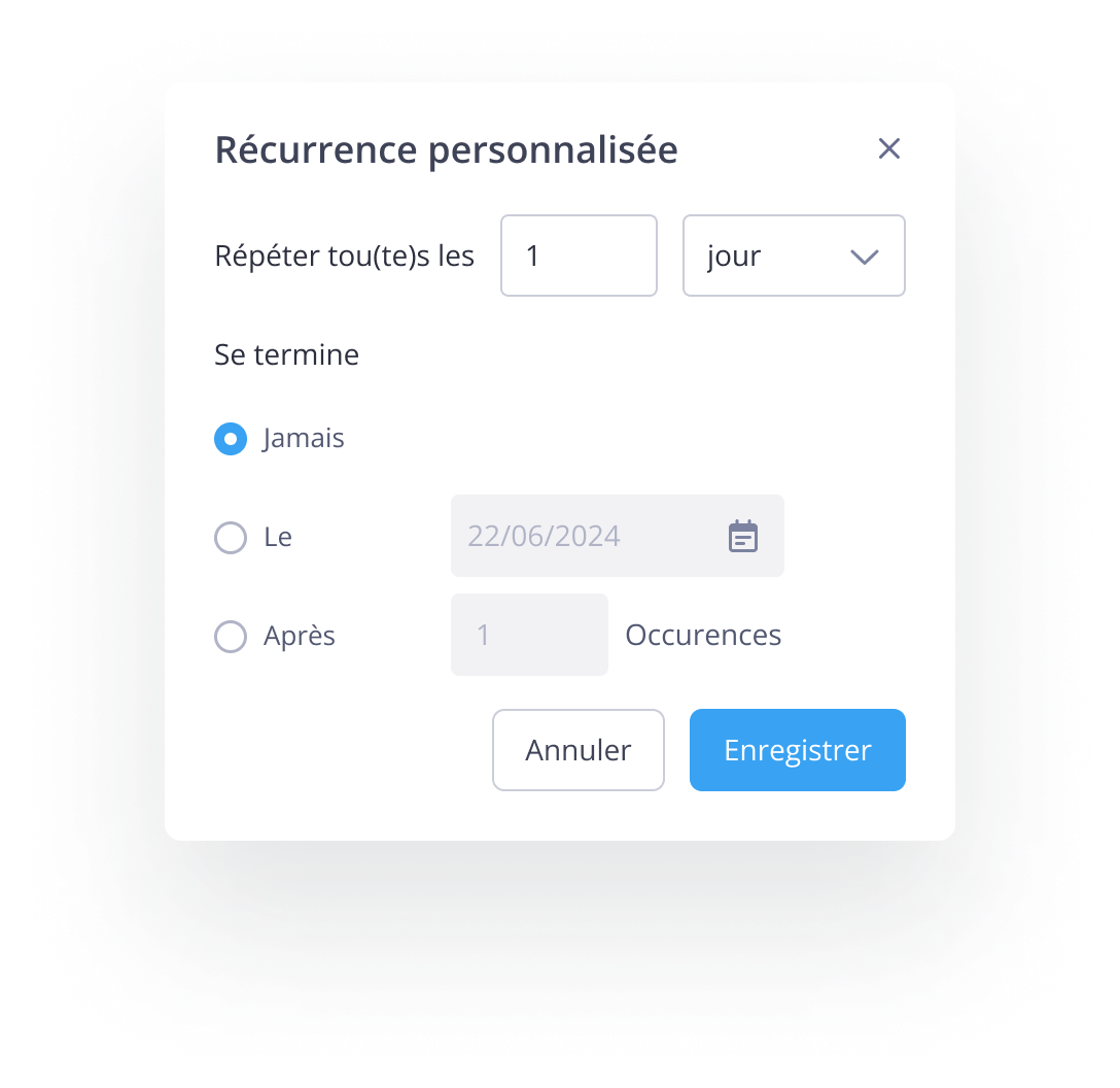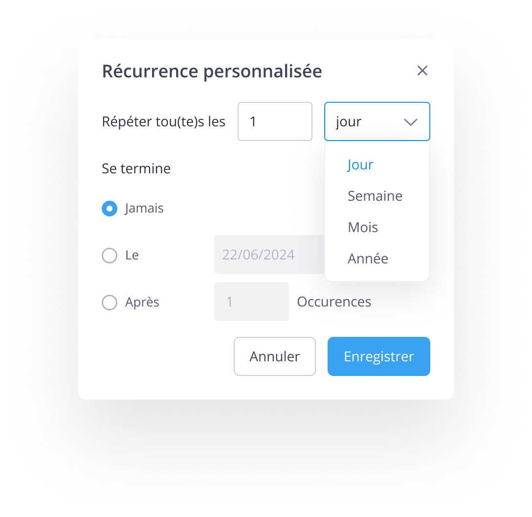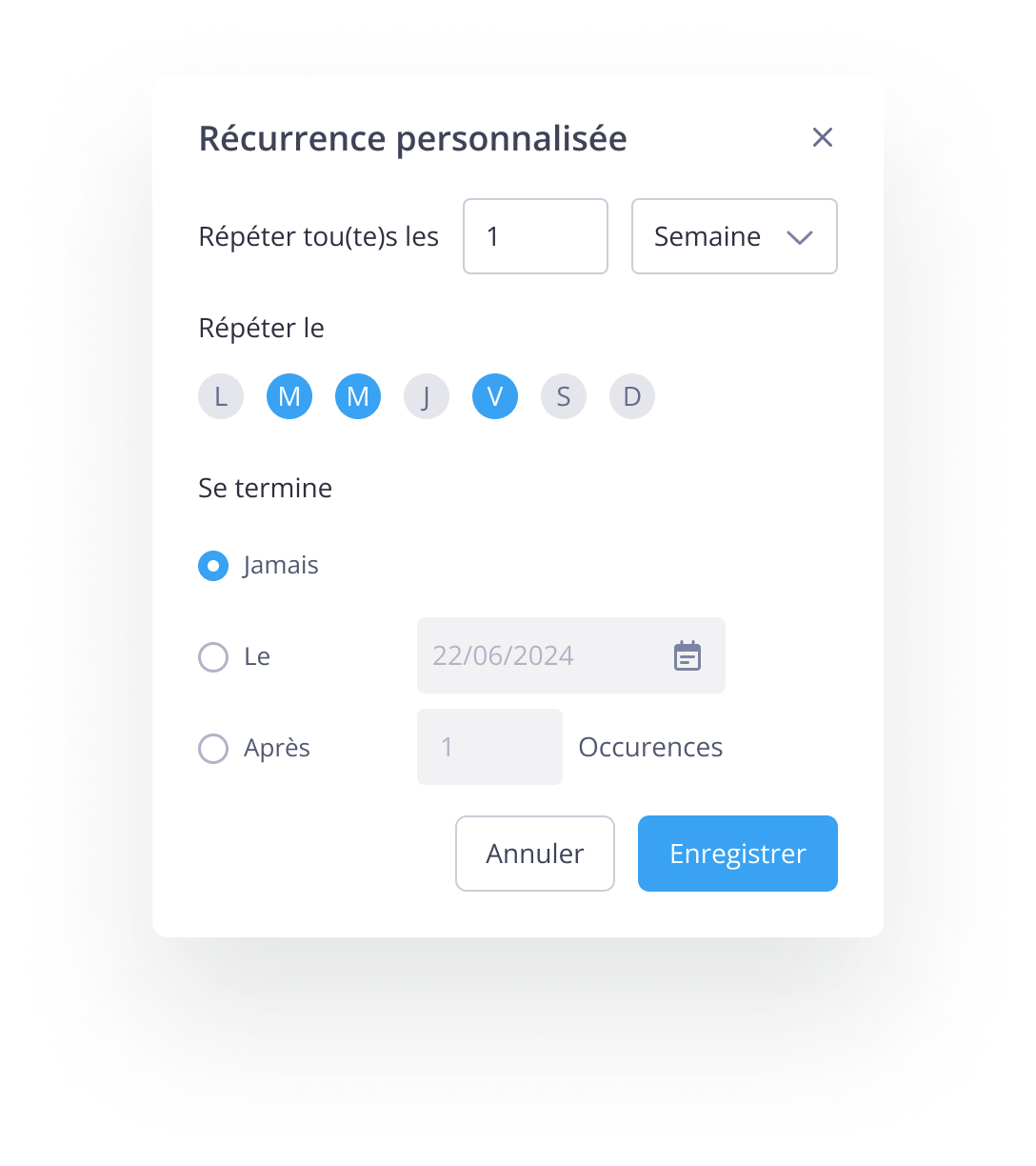 Lors de la création ou modification d’un événement, vous accédez à une fenêtre de paramétrage où vous choisissez le type de récurrence souhaité.