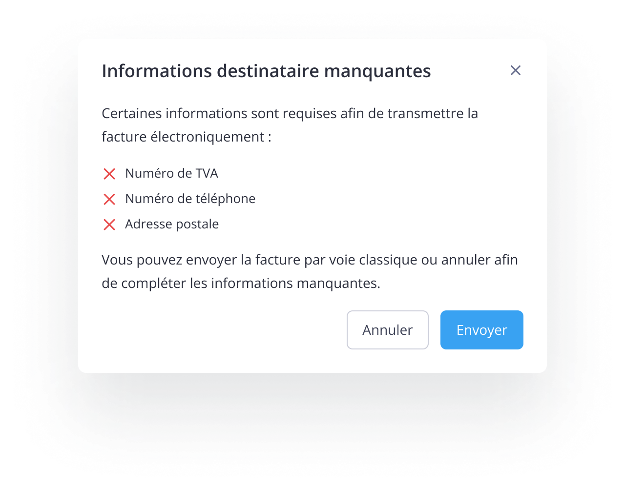 Vérification automatique des infos obligatoires : TVA, adresse, téléphone, etc.