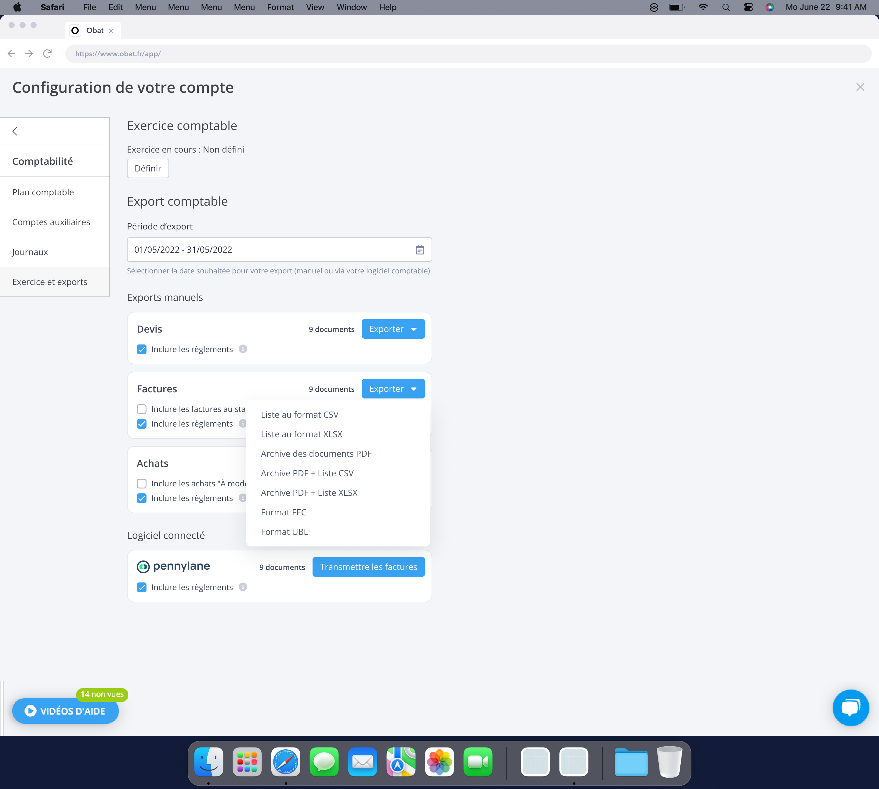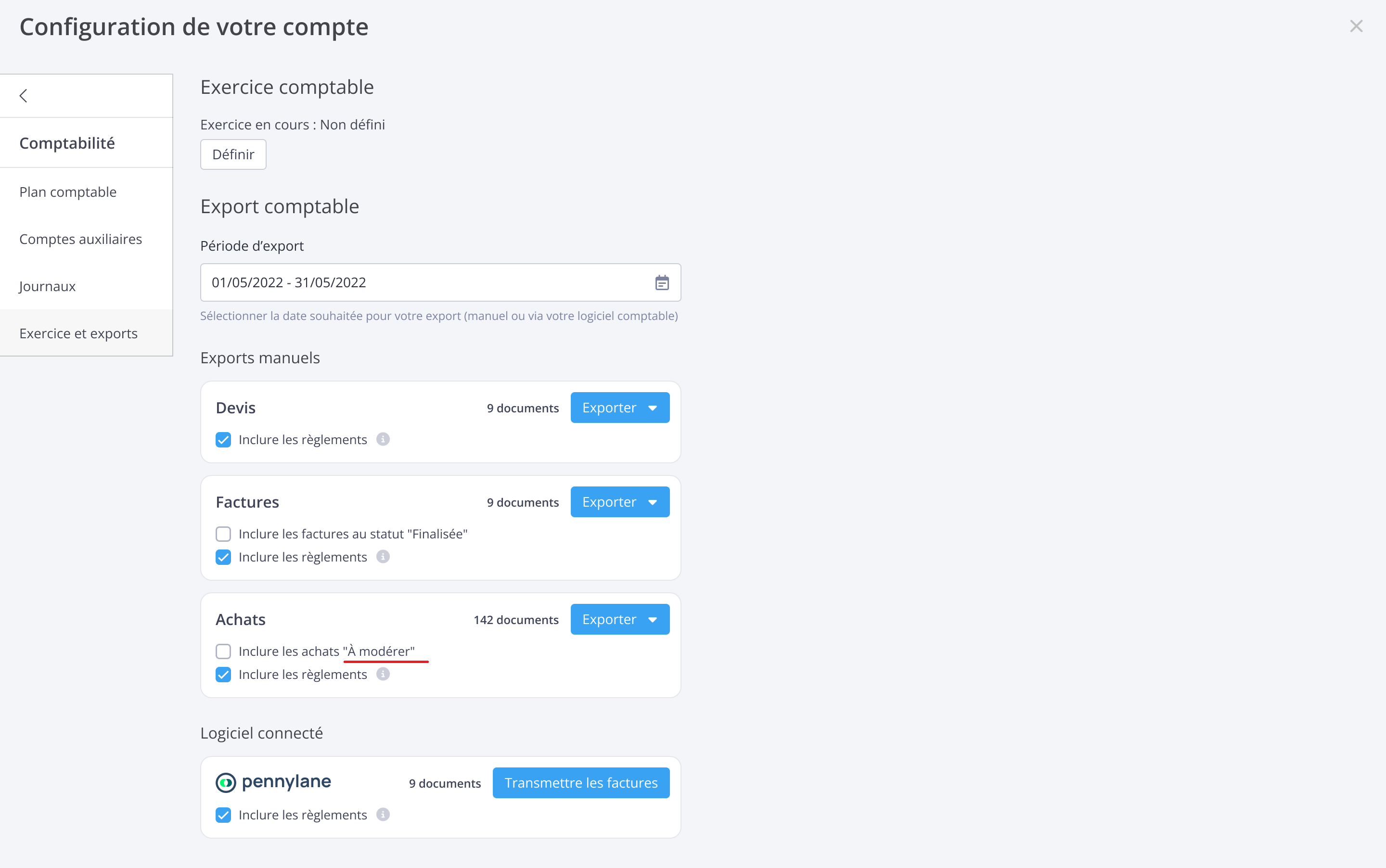 Depuis Configuration > Exercice et exports, vous pouvez :