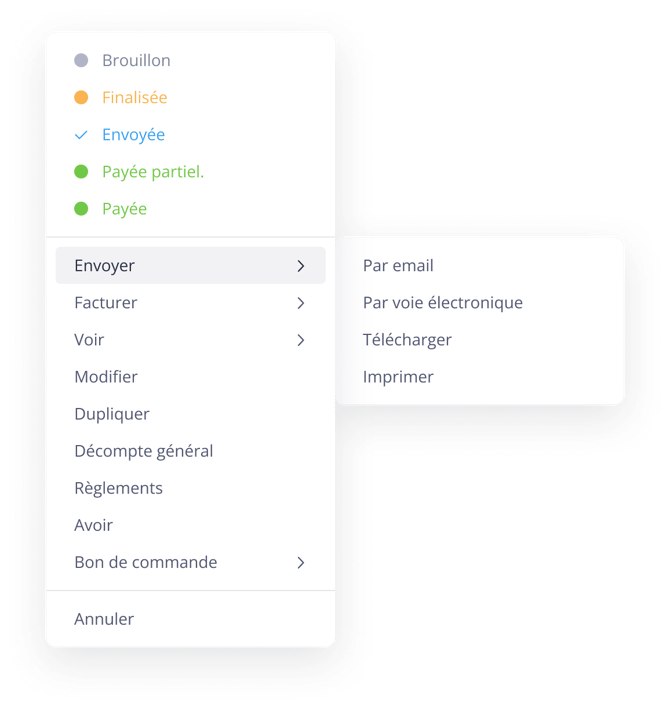 À la demande d’envoi d’une facture (ou au changement de statut Envoyé, Payé partiel, Payé), OBAT :