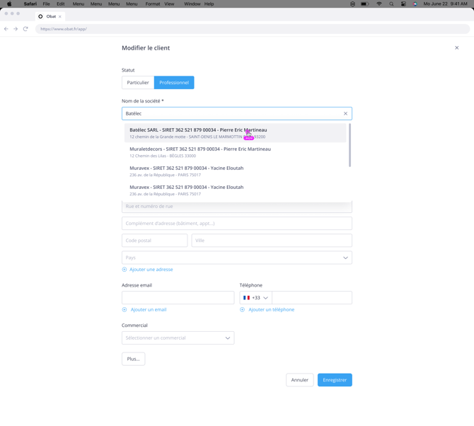 👉 Dès 2 caractères saisis, vous obtenez des suggestions précises. Il vous suffit de cliquer sur l’entreprise souhaitée, et OBAT remplit automatiquement :