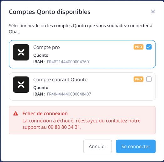 Si plusieurs comptes Qonto sont détectés, vous choisissez ceux à connecter à OBAT.