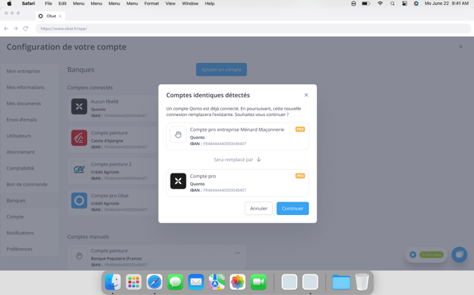 En cas de doublon d’IBAN (par exemple, un compte déjà connecté via Bridge), OBAT vous propose de remplacer l’ancien lien par la nouvelle connexion directe.