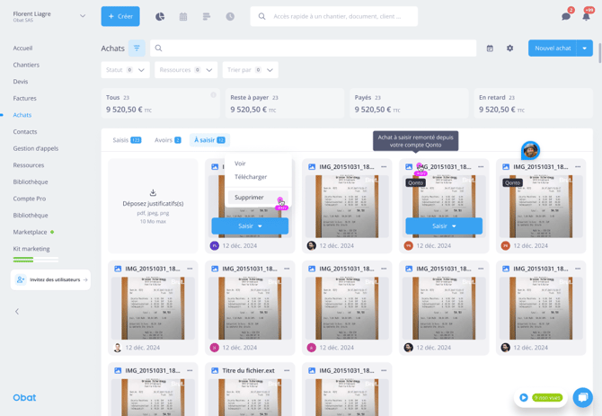 Qonto permet de joindre un justificatif juste après un achat. Ce document descend automatiquement dans OBAT en tant qu’achat à saisir.