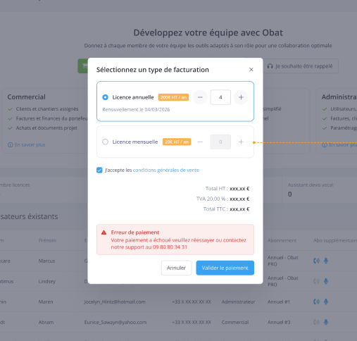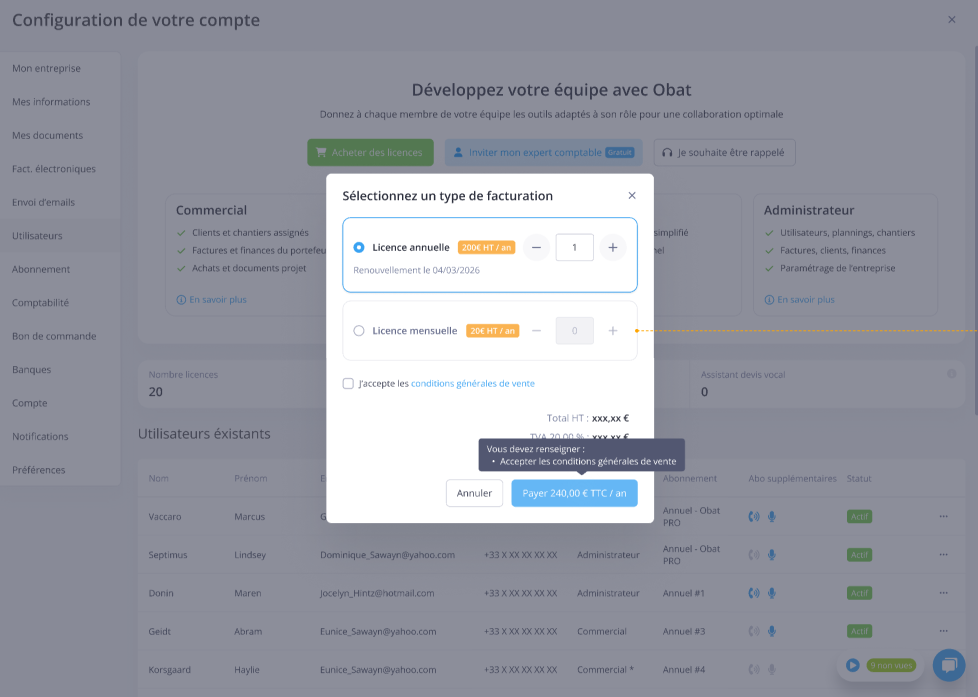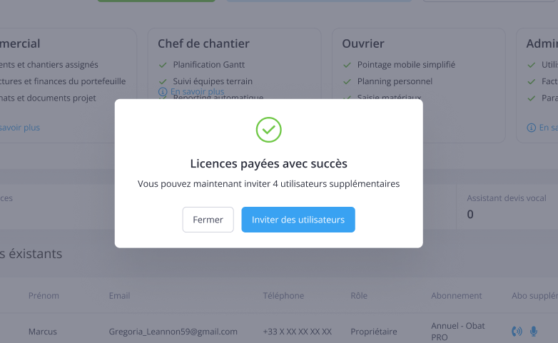 🔧 Marc, artisan avec 8 collaborateurs, veut les intégrer à OBAT. Il achète 8 licences d’un coup, puis les active progressivement, selon l’avancement de ses chantiers.