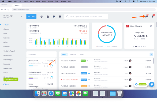 Depuis le widget Chantiers du tableau de bord : accès direct à la conversation d’un chantier.