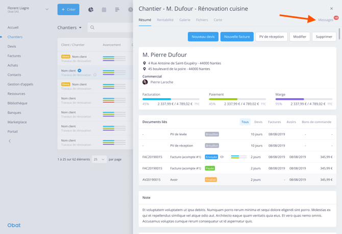 Depuis le panneau latéral d’un chantier : bouton “Messages” pour ouvrir ou créer une conversation liée au chantier.