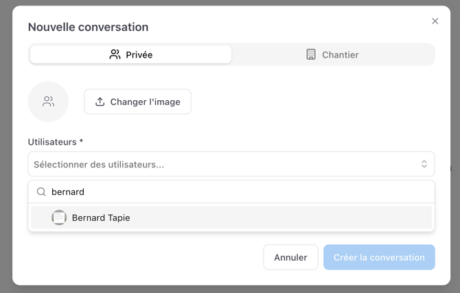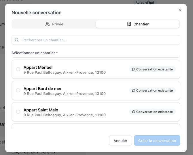 🔍 Une barre de recherche permet de retrouver facilement un chantier existant. Si une conversation existe déjà, elle est indiquée avec un tag “conversation existante”.