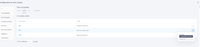 Votre expert-comptable ne pourra pas supprimer de compte comptable de vente dans Obat. Lorsqu'il survole l'option “Supprimer”, un message s'affiche : “Compte géré par Obat”, indiquant que ces comptes sont préconfigurés et ne peuvent pas être supprimés.