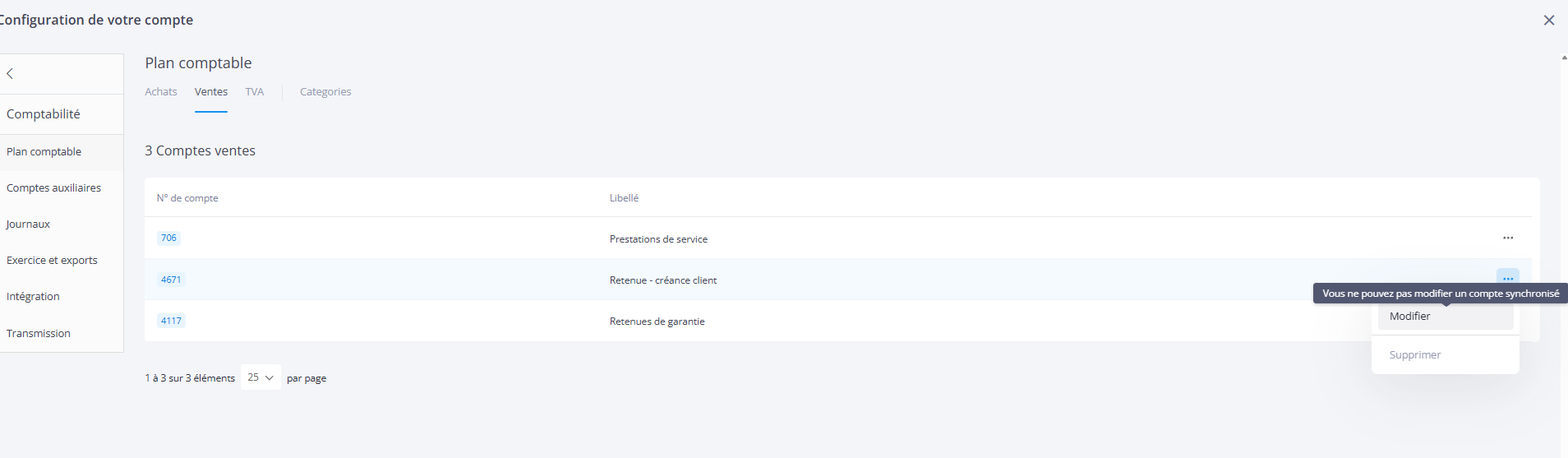 Si des modifications sont nécessaires, votre expert-comptable devra ajuster la configuration comptable directement dans l'onglet “Intégration” pour que les changements soient pris en compte.