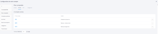 - Les comptes comptables de ventes sous l'onglet “Ventes”