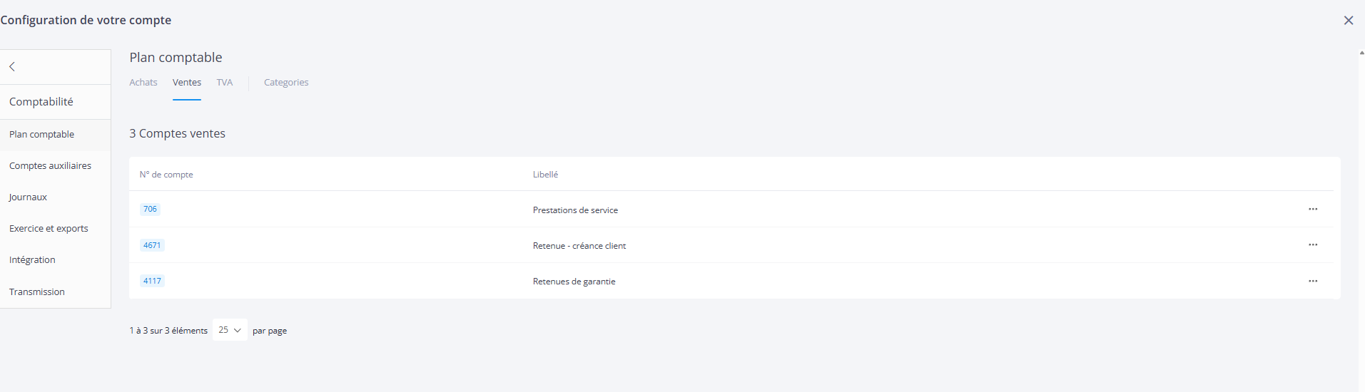 Lorsque vous accédez à Plan comptable, vous êtes par défaut dirigé vers le paramétrage des comptes comptables de vente dans l'onglet “Ventes”.