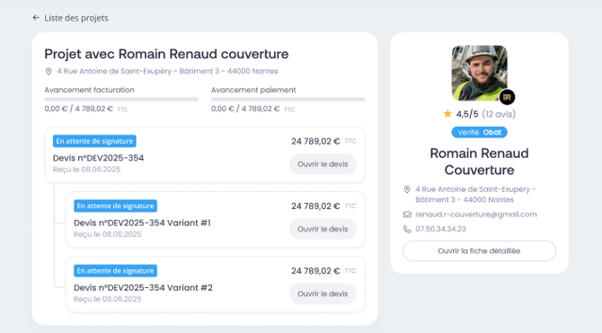Pour chaque chantier, votre client voit :