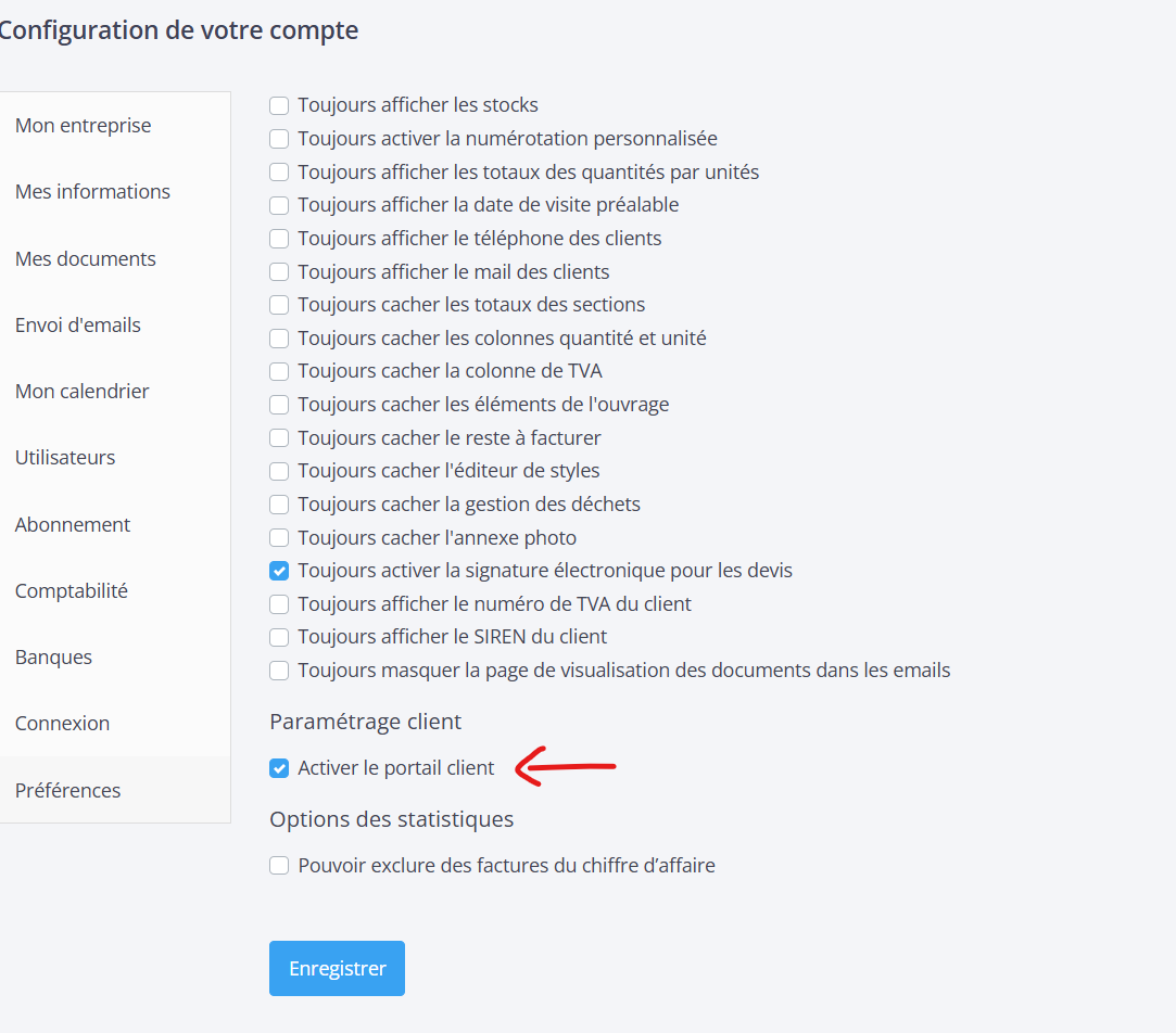 Les artisans doivent activer le portail depuis les préférences afin que leurs clients puissent y accéder et recevoir leurs devis et factures.