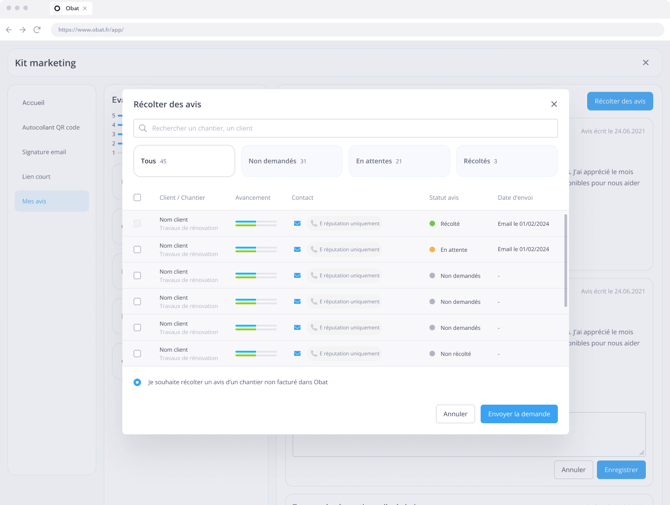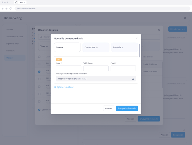 Récoltez des avis clients même sans chantier créé dans OBAT ! (Bientôt disponible)